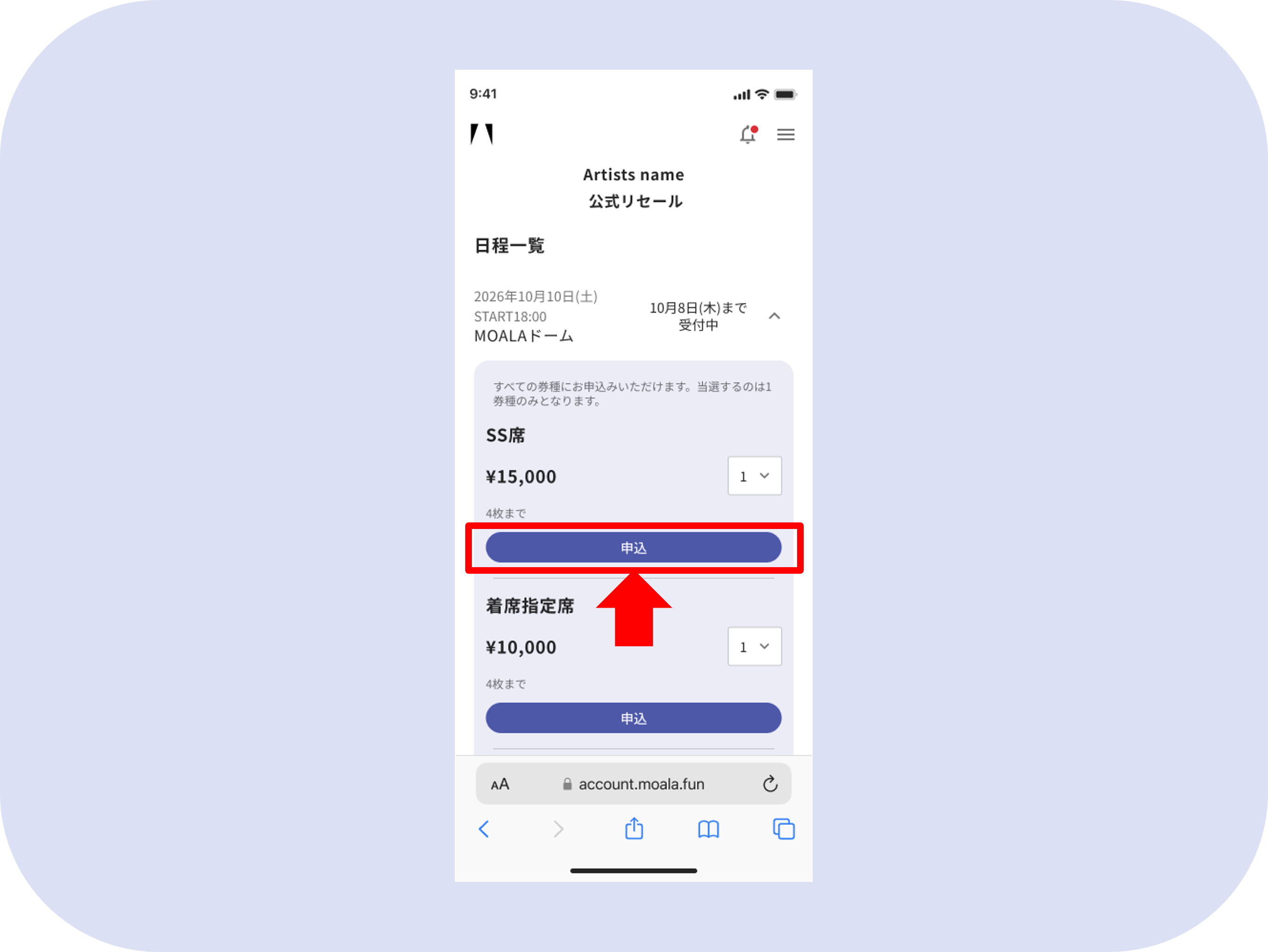 公式リセールサイトにアクセスし、公演一覧から希望する日程・席種・枚数を選んでお申し込みください。