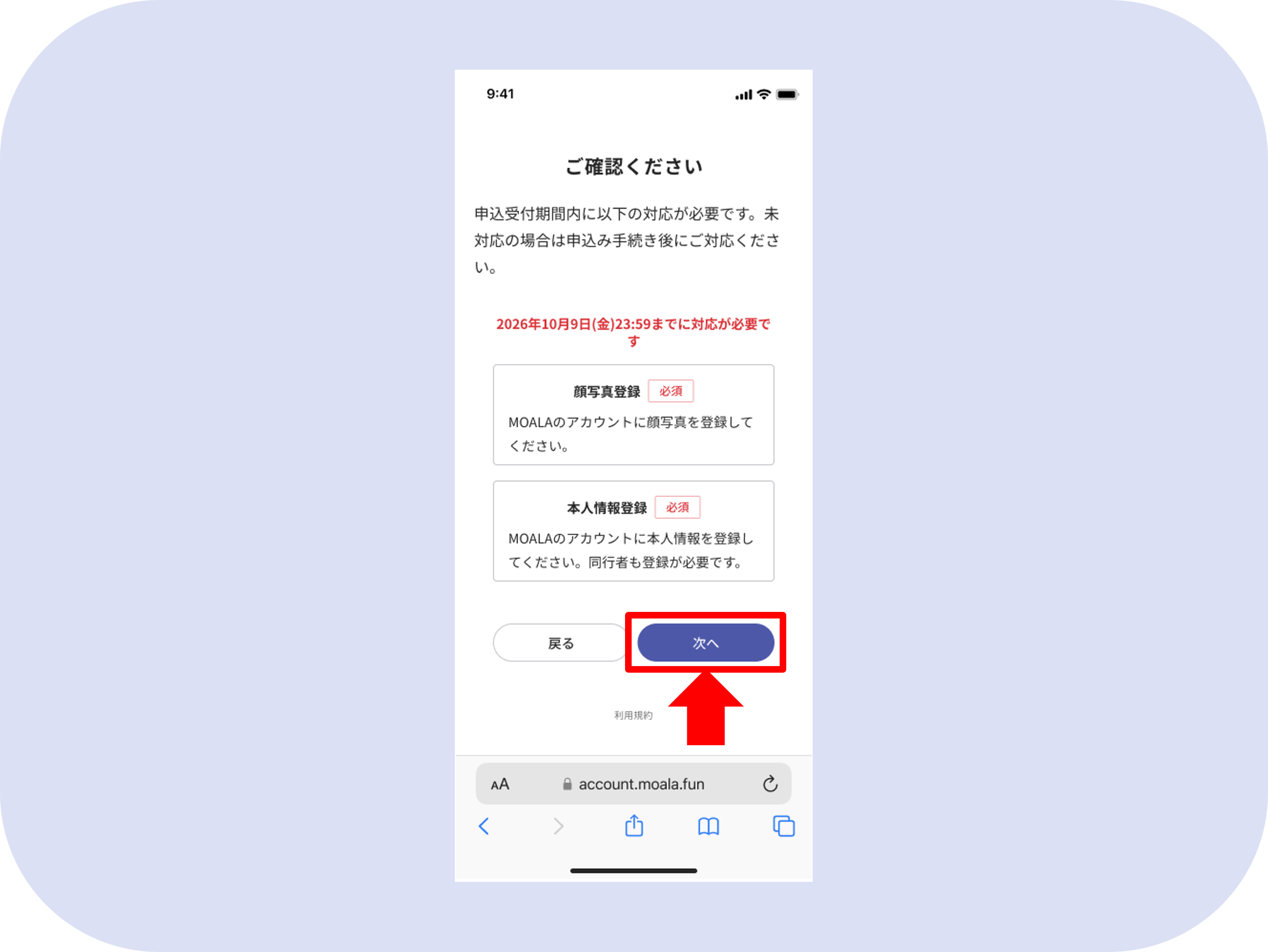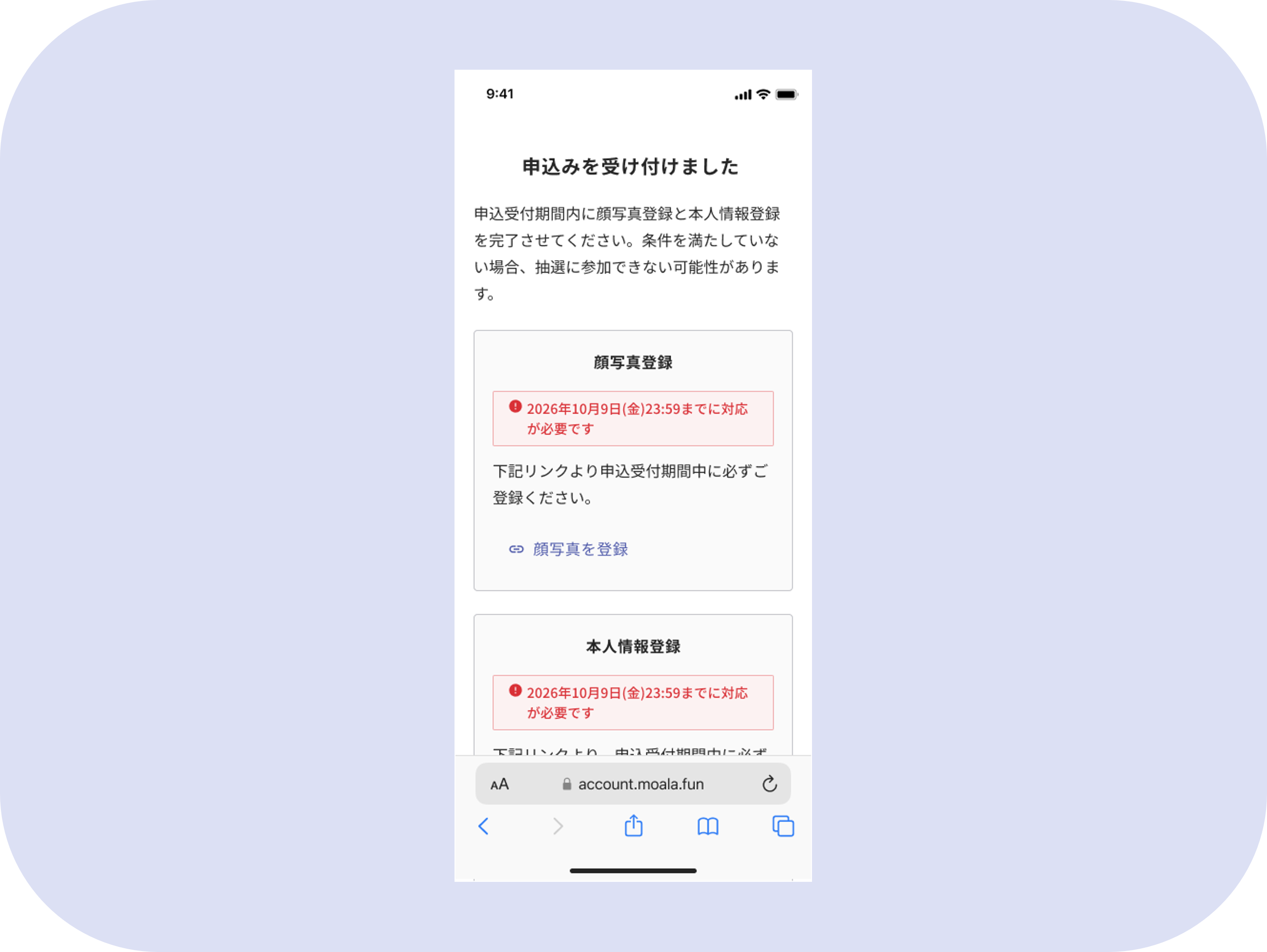 ※お申込には、MOALAのアカウントに「本人情報」と「顔写真」をご登録いただく必要がございます。登録方法は