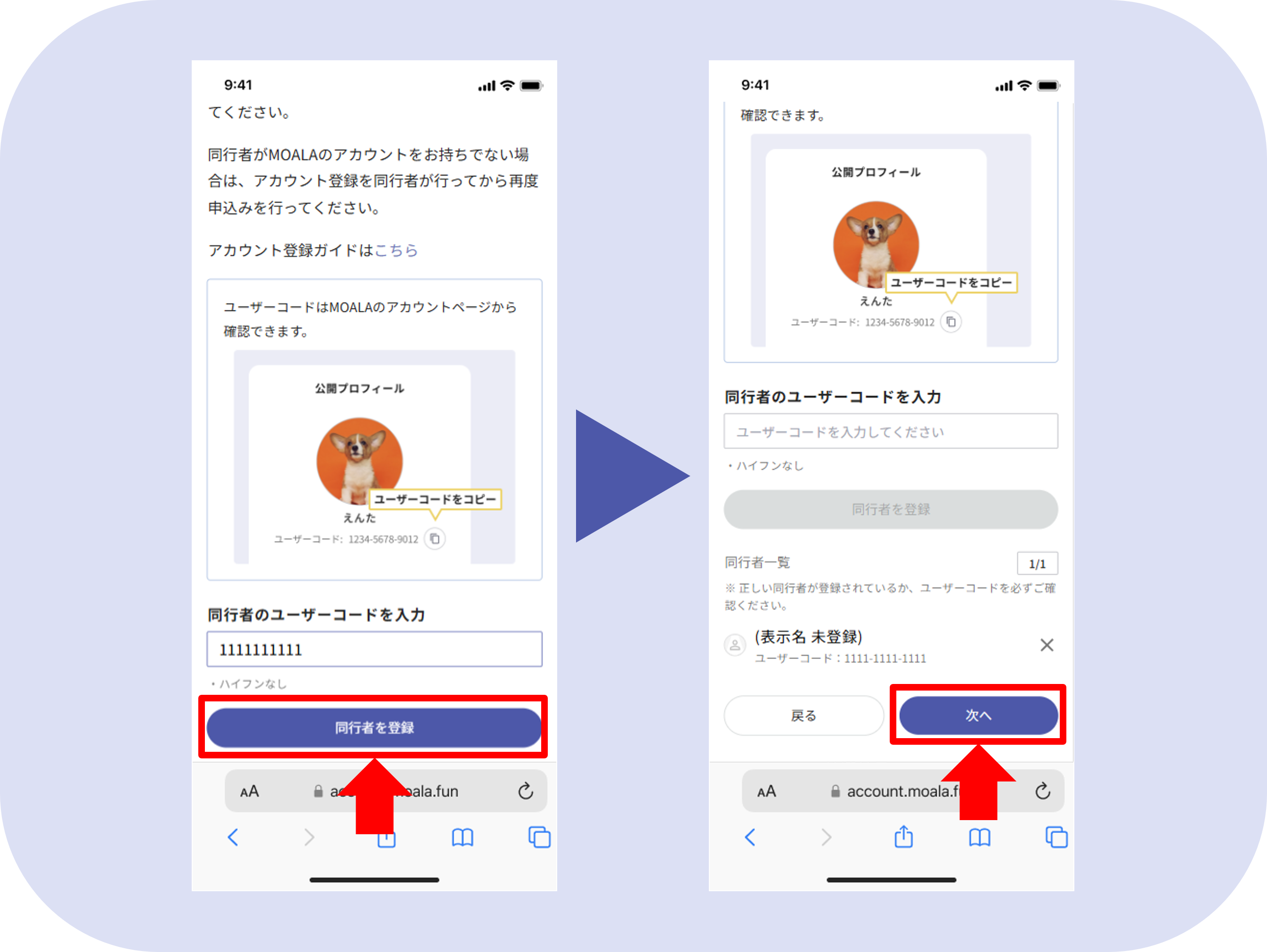 お申し込みの際に、同行者のMOALAのアカウントの「ユーザーコード」を入力し、同行者を登録してください。