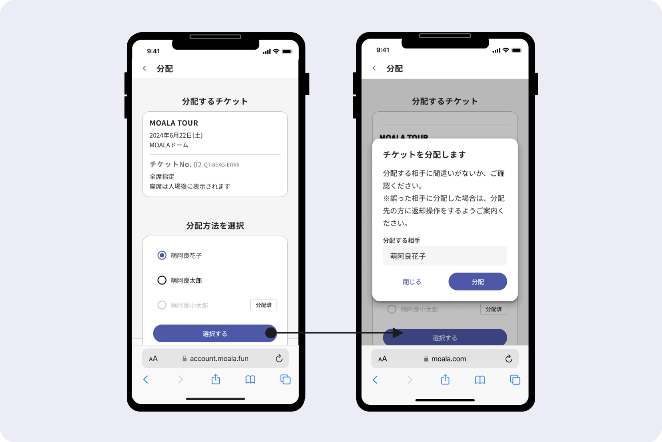 分配する相手を選択し[選択する]>[分配]を押してください。