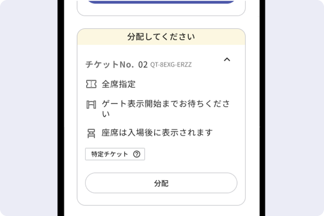 同行者に返却したいチケットを表示して、[分配]を押してください。