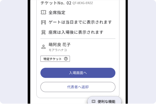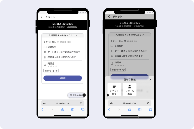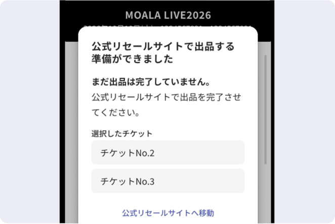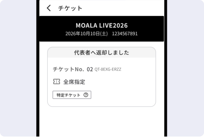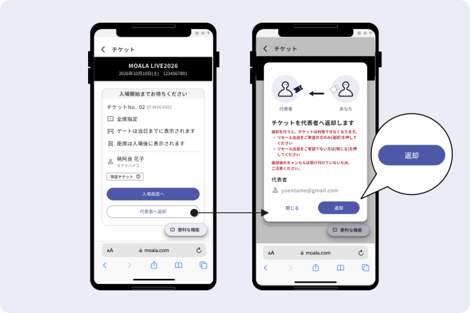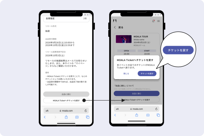[MOALA Ticketへチケットを戻す]>[チケットを戻す]を押すとMOALA Ticketにチケットが戻ります。