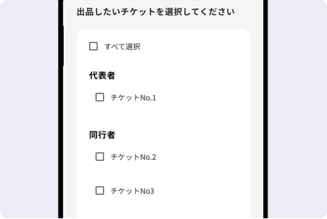 同行者のチケットを出品する場合は、チケットを代表者へ返却し代表者が出品申込を行ってください。