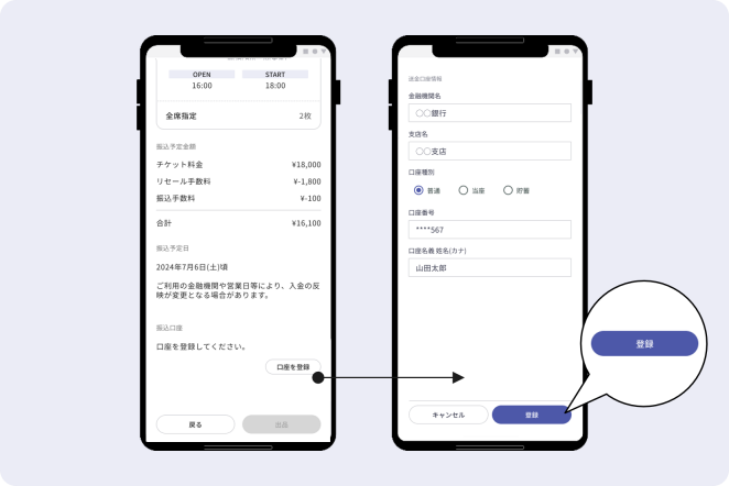 [口座情報を登録]を押し、リセールが成立した場合の代金受取口座を入力後、[登録]を押してください。