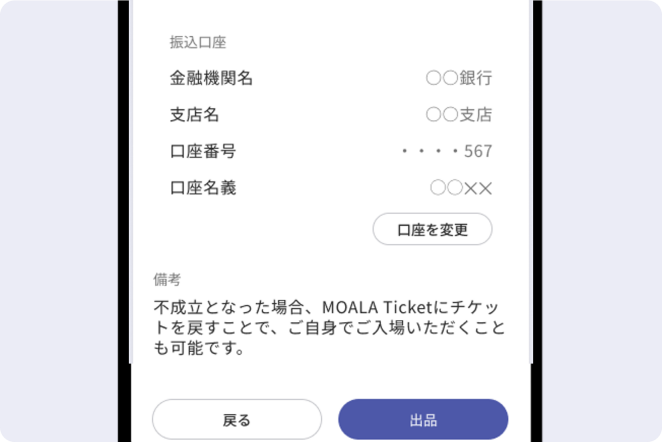 チケットや手数料、登録口座などを確認し[出品]を押してください。